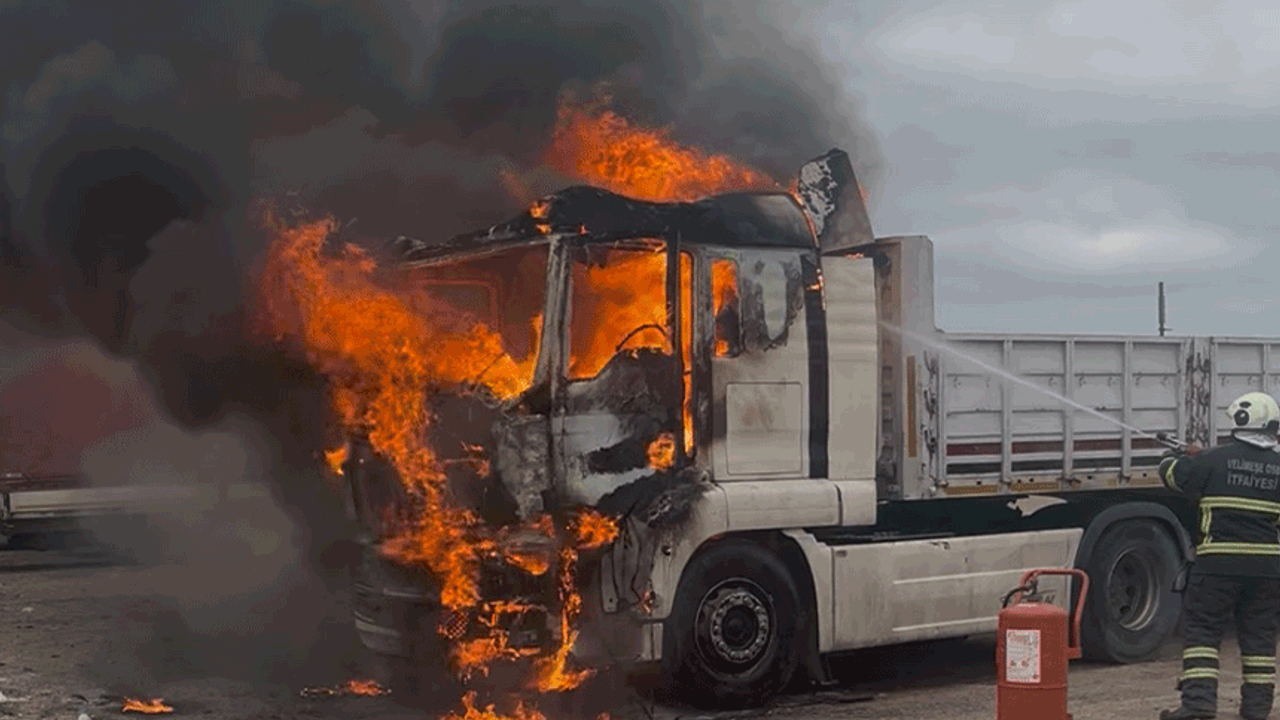 Yangın sonrası tır kabini hurda yığınına döndü. Yangının sigorta kutusundan çıkmış olabileceği öne sürüldü.