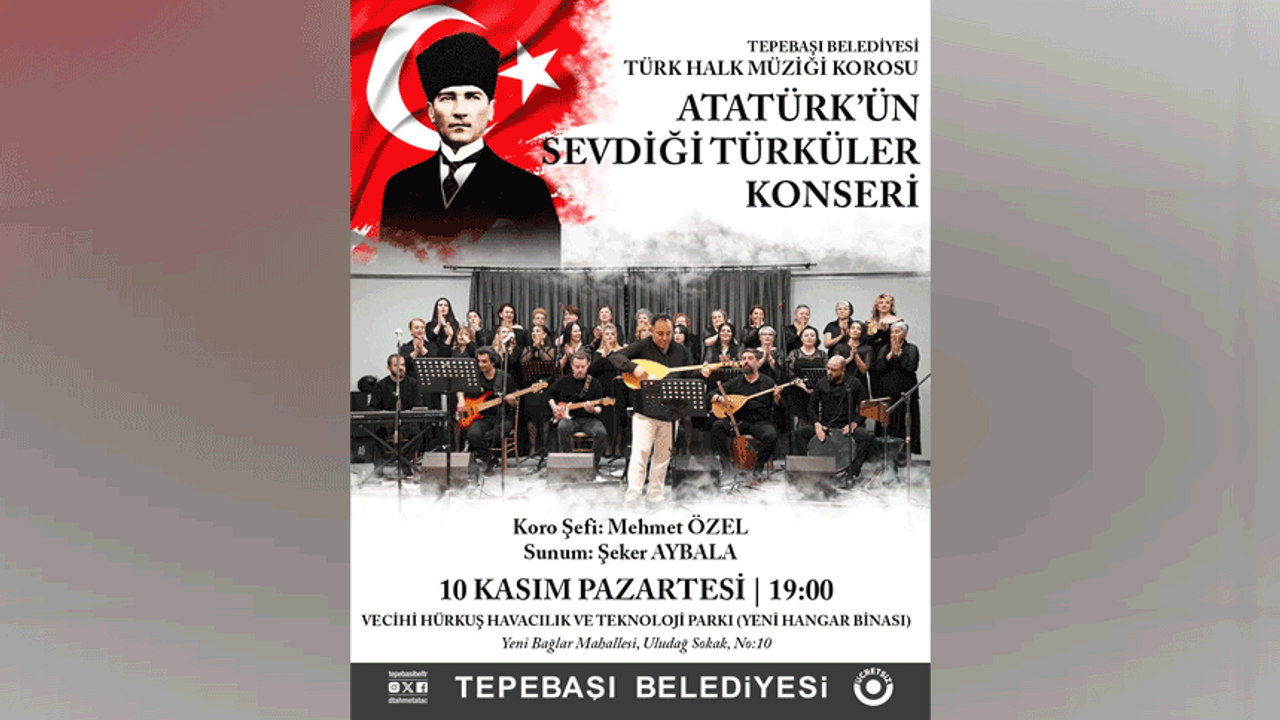 Tepebaşı Belediyesi Türk Halk Müziği Korosu’nun, şef Mehmet Özel eşliğinde sahne alacağı konser, 10 Kasım Pazar günü saat 19.00’da Vecihi Hürkuş Havacılık ve Teknoloji Parkı’nda (Yeni Hangar Binası) gerçekleştirilecek.