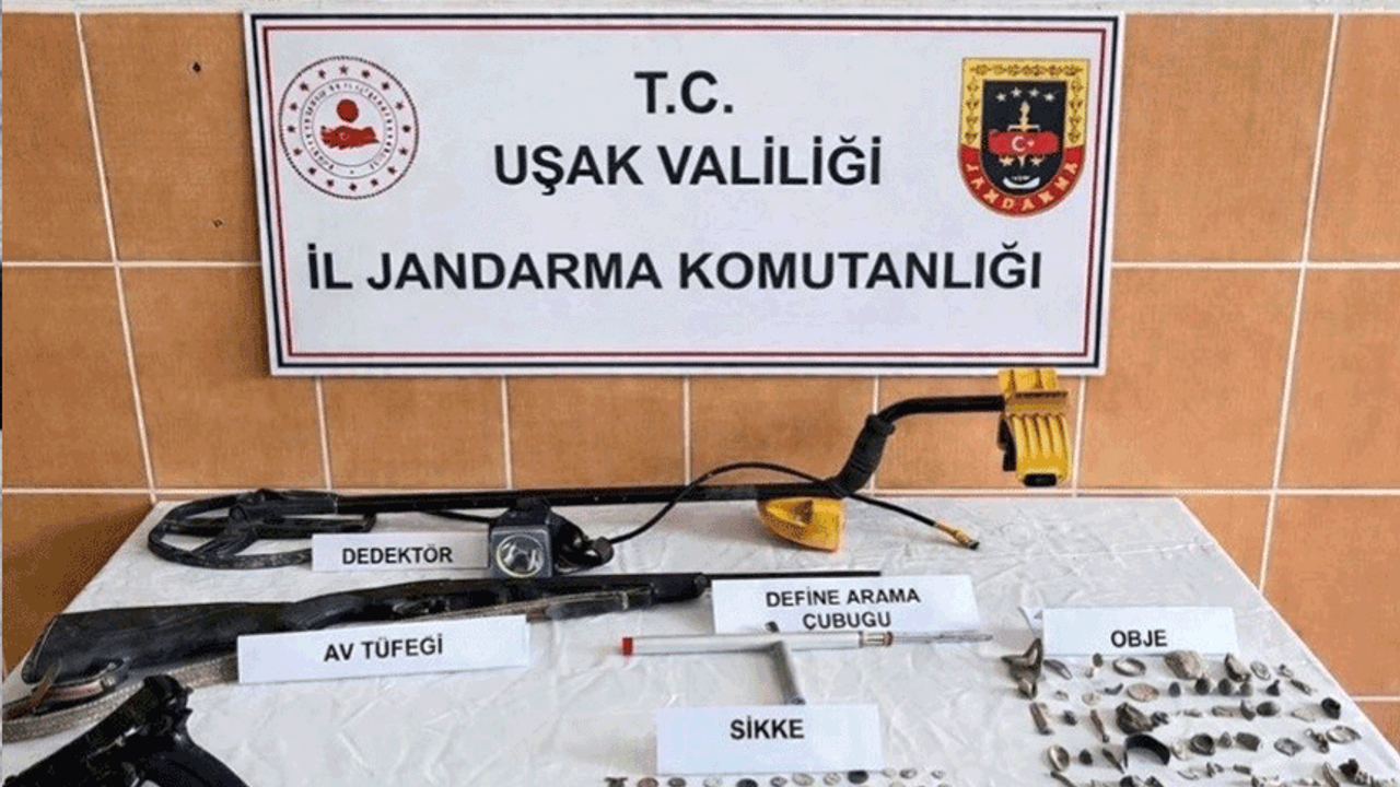 Uşak İl Jandarma Komutanlığınca, kaçakçılık olaylarını önlemek amacıyla yürütülen çalışmalar kapsamında, Ulubey ilçesine bağlı Küçükkayalı köyünde ikamet eden 53 yaşındaki H.S.’nin evine operasyon düzenlendi. Adreste yapılan aramalarda, 48 adet Osmanlı dönemine ait sikke, 75 adet tarihi obje, 7 adet 7.65 mm tabanca fişeği, 1 adet dedektör, 1 adet define aramak amacıyla kullanılan metal çubuk ile 1 adet kuru sıkı tabanca ele geçirildi.