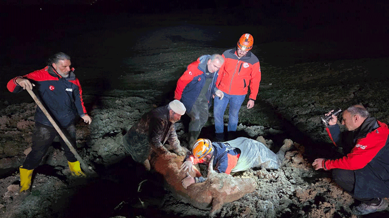 Ekiplerin uzun süren çalışmaları sonucunda, mahsur kalan vatandaş ve büyükbaş hayvan bulundukları alandan güvenli şekilde çıkarıldı.